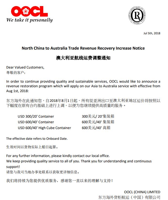 自2018年8月1日起,所有从亚洲出口至澳大利亚地区运价将按照以下幅度在原有合约基础上进行上调,以便为您继续提供高质量的服务。公告通知具体见下图: