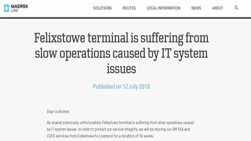 据悉,英国最大的集装箱港口费利克斯托(Felixstowe)港最近因码头操作系统(TOS)的升级过程出现状况,导致码头作业非常缓慢,效率低下,目前已经造成港口货物严重积压,大量集装箱船及货物严重延误!