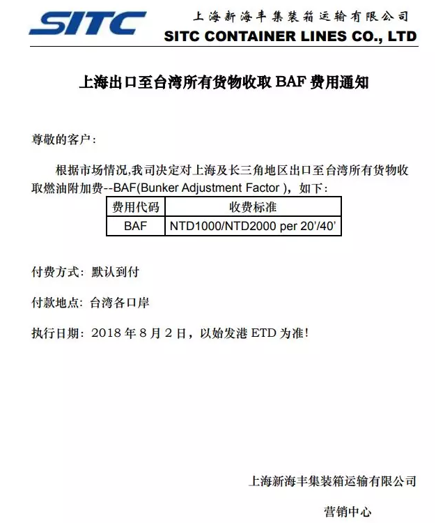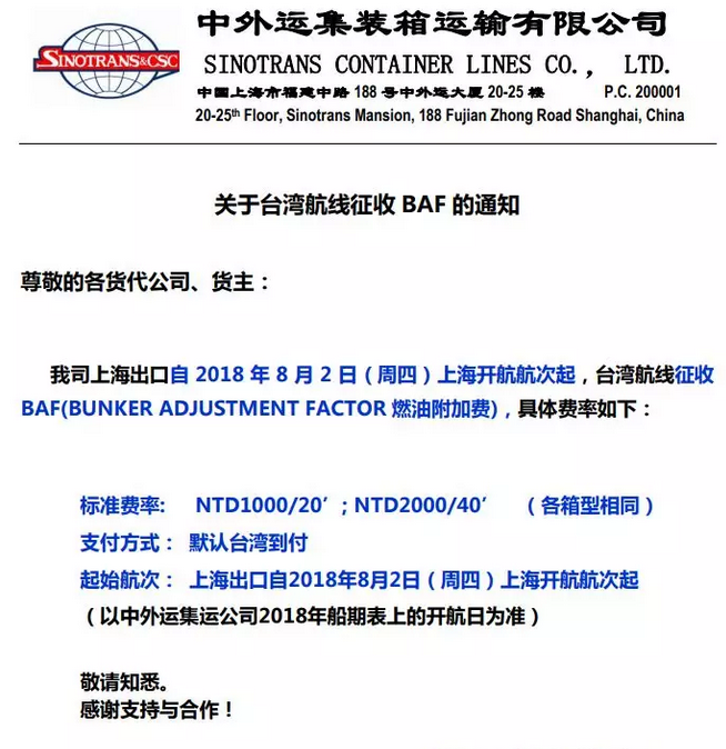 对上海及长三角地区出口至台湾所有货物收取燃油附加费