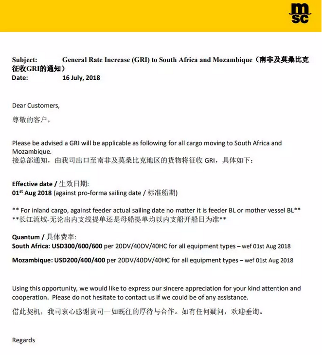 注意 | 近期船公司通知(ONE/MSK)、及费用调整汇总(SITC/SNL/CMA/MSC)!