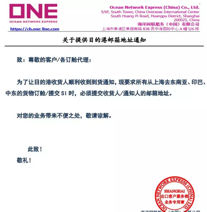 现要求所有从上海去东南亚、印巴、 中东的货物订舱/提交 SI 时,必须提交收货人/通知人的邮箱地址