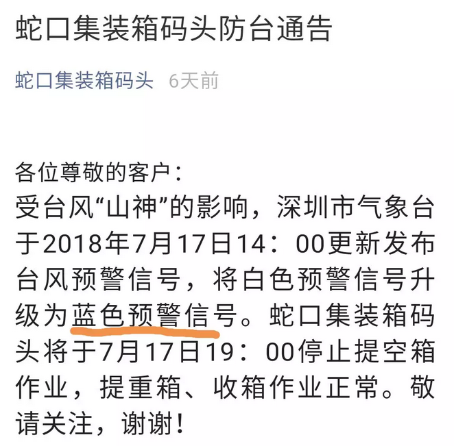 但多位业内人士指出,白色预警之后一般很快进入蓝色预警,而一旦蓝色预警生效后,码头将先暂停提还空箱的业务!