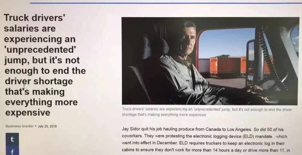 来自美国当地媒体报道,因新规ELD 的实施,美国拖车非常紧张,已有美国拖车已经开始上涨15%的运费!