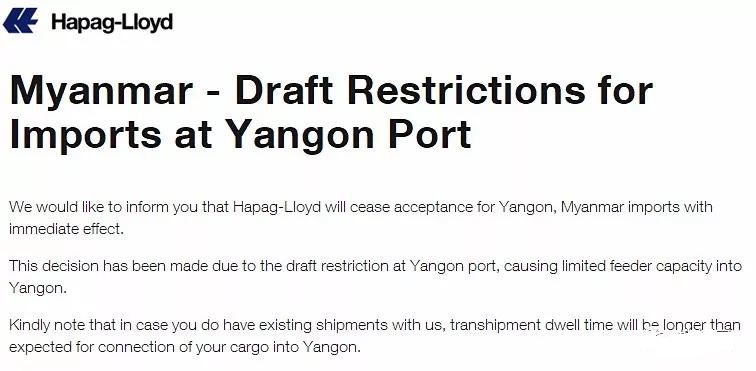 ▲Hapag-Lloyd不再接收缅甸进口货物