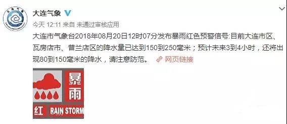 大连市气象台2018年08月20日连续发布暴雨红色预警信号。预计今天白天,海区风力9到10级阵风11~12级,陆地风力7级阵风8~9级,夜间以后风力逐渐减弱,强降雨将持续到今天夜间结束。