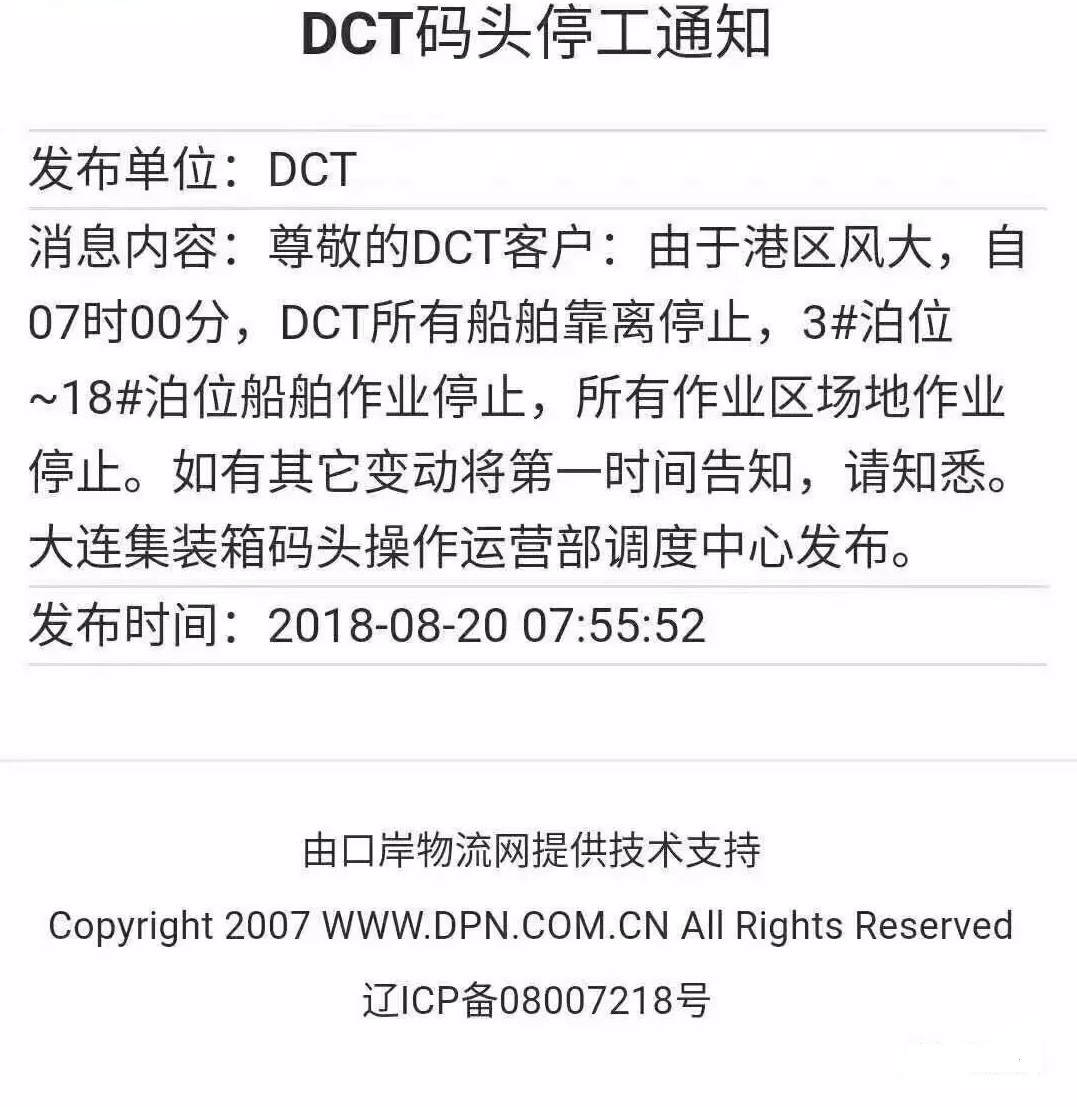 大连集装箱码头发布码头停工通知。大连连续降雨,所有到场地卸货的均不能保证及时卸货,码头作业也已经暂停,货主货代们注意关注码头最新动态,望转发周知~