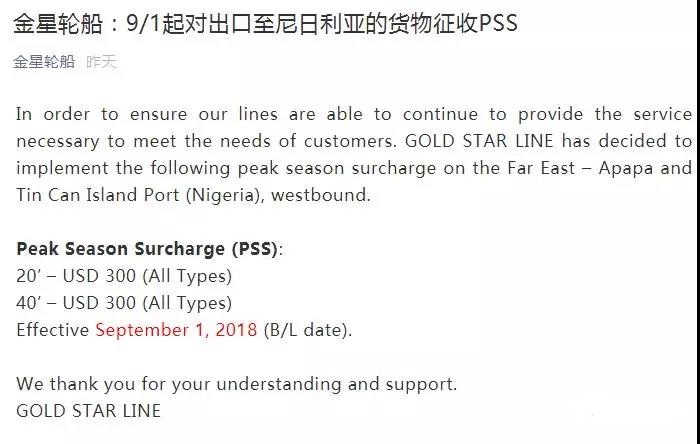 GSL关于9/1起对出口至尼日利亚的货物征收PSS