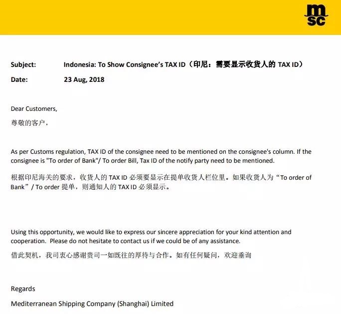 根据印尼海关的要求,收货人的 TAX ID 必须要显示在提单收货人栏位里。如果收货人为“To order of Bank”/ To order 提单,则通知人的 TAX ID 必须显示。