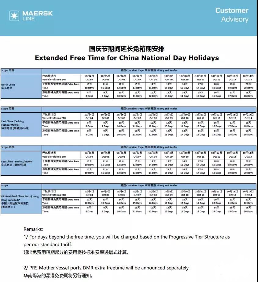 尊敬的客户:我们高兴地通知您,在国庆期间所有由马士基航运承运的出口货物,你将在标准免箱期之外额外享有更长的免箱期。