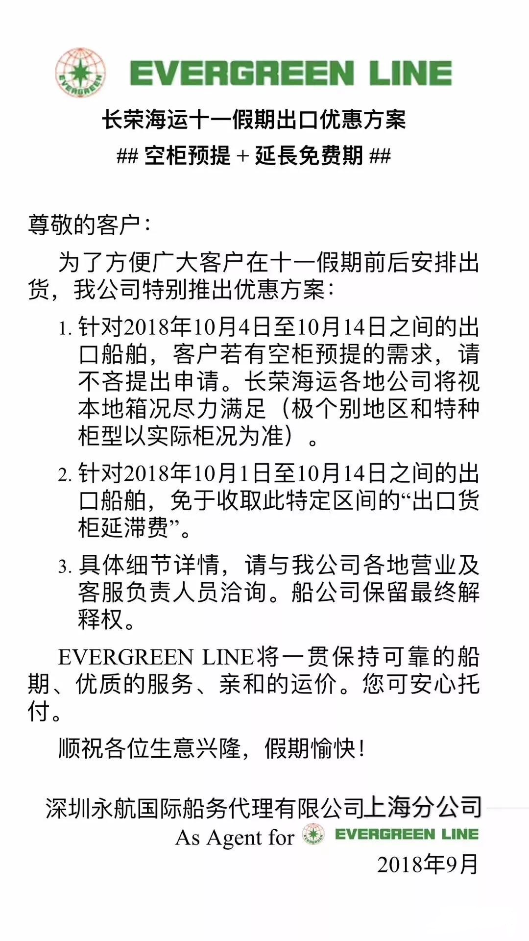 为了方便广大客户在十一假期前后安排出货,特别推出优惠方案。空柜预提、延长免费期。