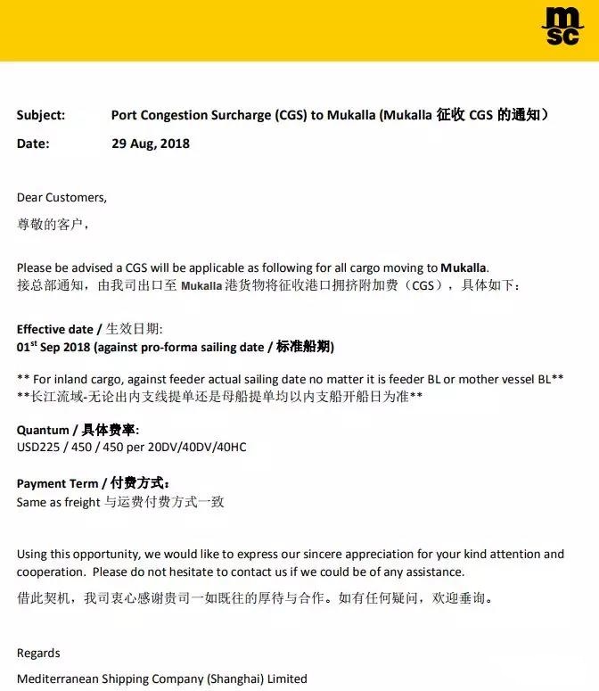 MSC出口至Mukalla将征收港口拥挤附加费CGS
