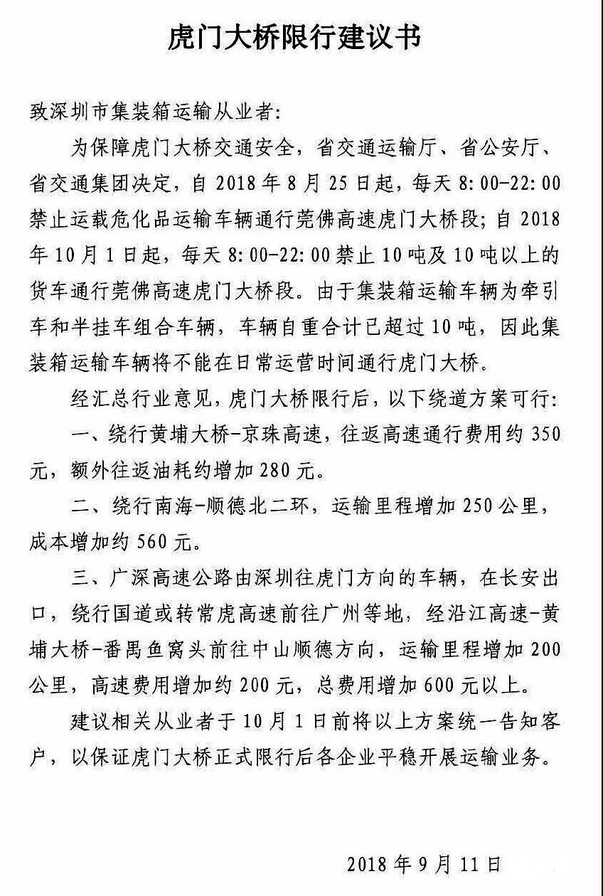 由于集装箱拖车为牵引车和半挂车组合车辆,拖车自重就已经超过10吨了,所以这个规定说白了,就是从10月1日起,每天早上八点到晚上10点这14个小时内,所有拖车将不能通过虎门大桥,即使拉个空箱也不行!