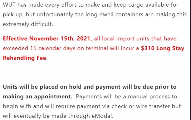 塔科马-华盛顿联合港口(WUT)11月1日发布官方公告:宣布将于11月15日起,对码头上滞留超过15个日历日的进口集装箱开征码头超期滞留处理费(Long Stay Rehandling Fee),收费标准是每个集装箱收取310美元!