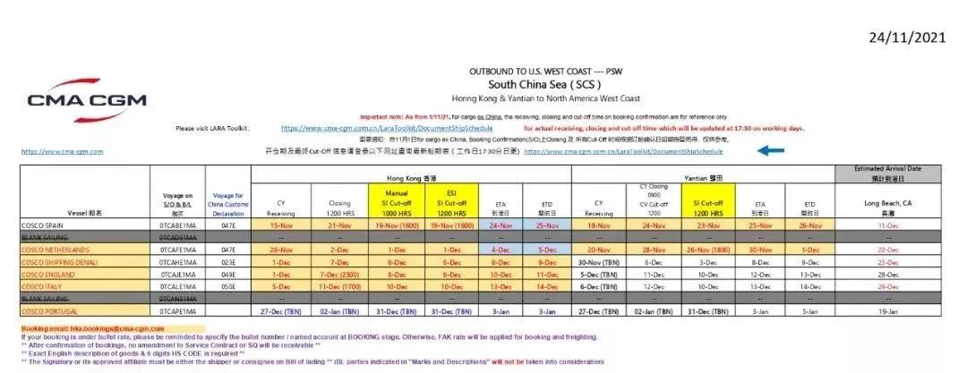 马士基在24日发布的最新市场资讯报告称,预计12月的总体需求依旧强劲。北美港口拥堵情况最近有所恶化,洛杉矶/长滩/西雅图的船舶等待时间增加到21天。港口拥堵仍将导致航次空班和运力短缺。