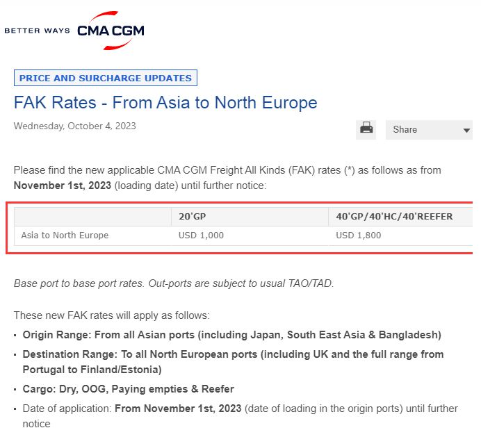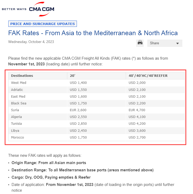 10月4日,CMA宣布调整从亚洲到地中海和北非FAK费率。自2023年11月1日(装货日期)起生效,直至另行通知。具体收费标准如下: