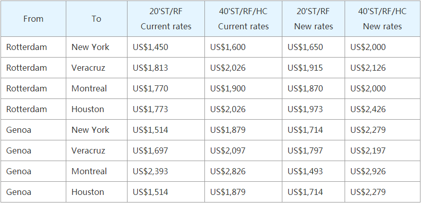 更新后的费率将从11月23日起对干集装箱生效,11月25日对冷藏货物生效。
