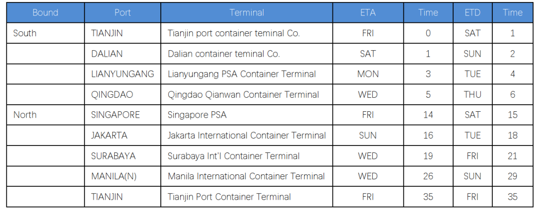 NIS航线南下挂靠天津、大连、连云港、青岛等港口,北上挂靠新加坡、雅加达、泗水、马尼拉、天津等港口。