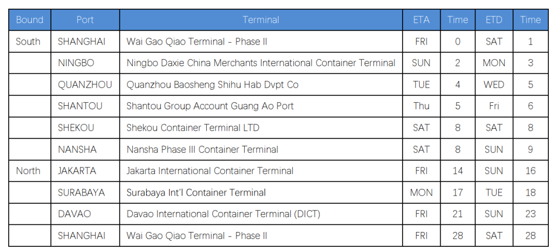 SIS航线南下挂靠上海、宁波、泉州、汕头、蛇口、南沙等港口,北上挂靠雅加达、泗水、达沃、上海等港口。