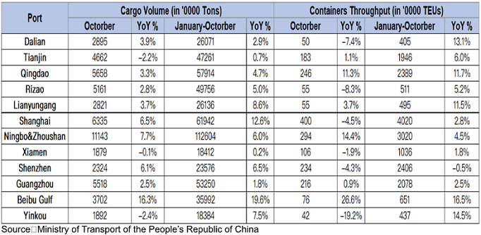 就集装箱吞吐量而言,三大港口在1月至10月期间表现出色。位于前列的是上海,实现2.8%的同比小幅增长,处理4020万标准箱。